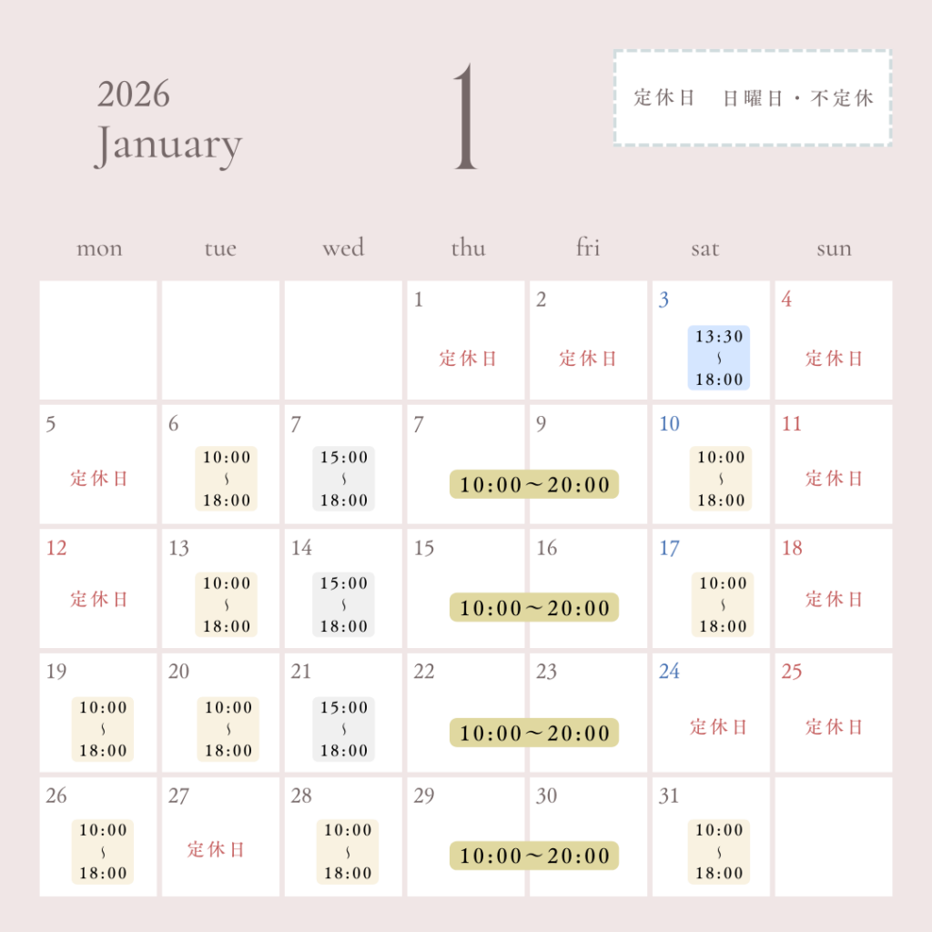 空き状況はInstagramをチェック お知らせ よかったらシェアしてね! URLをコピーしました! URLをコピーしました! 年末年始の診療日について 関連記事 年末年始の診療日について 2025年11月11日 12月の診療日について 2025年11月11日 11月の診療日について 2025年10月16日 10月の診療日について 2025年9月9日 9月の診療日について 2025年8月14日 8月の診療日について 2025年7月18日 7月の診療日について 2025年6月24日 6月の営業日について 2025年6月11日