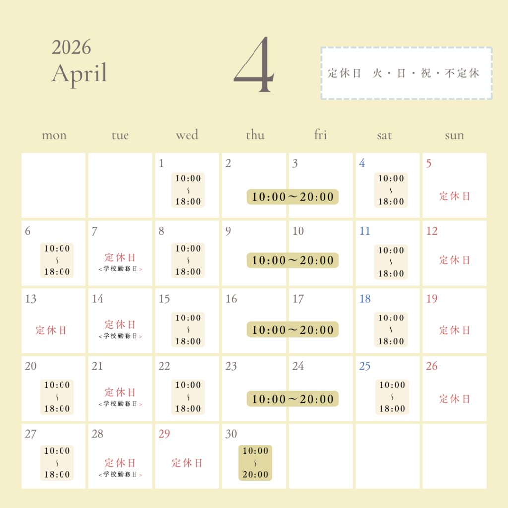 4月より専門学校の勤務時間が長くなるため、授業のある毎週火曜日は定休日とさせていただきます。 ご迷惑をお掛けして申し訳ありませんがよろしくお願い致します。 院長 藏田健悟 空き状況はInstagramをチェック \ 最新情報をチェック / FacebookXBlueskyHatenaCopy お知らせ よかったらシェアしてね! URLをコピーしました! URLをコピーしました! 2026年3月の診療日について 2026年5月の診療日について 関連記事 2026年5月の診療日について 2026年4月16日 2026年3月の診療日について 2026年2月4日 2026年2月の診療日について 2026年1月19日 2026年1月の診療日について 2025年12月11日 年末年始の診療日について 2025年11月11日 12月の診療日について 2025年11月11日 11月の診療日について 2025年10月16日 10月の診療日について 2025年9月9日